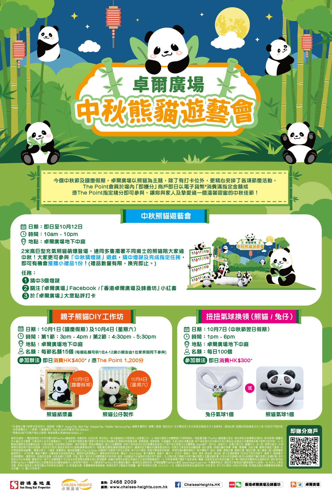 卓爾廣場 ● 中秋熊貓遊藝會 今個中秋節及國慶假期,卓爾廣場以熊貓為主題,除了有打卡位外,更精心安排了各項節慶活動,The Point會員於場內「即賺分」商戶即日以電子貨幣消費滿指定金額或憑The Point指定積分即可參與,讓你與家人及摯愛過一個溫馨甜蜜的中秋佳節! 活動受條款及細則約束,詳情請參閱場內宣傳品或向顧客服務中心查詢。