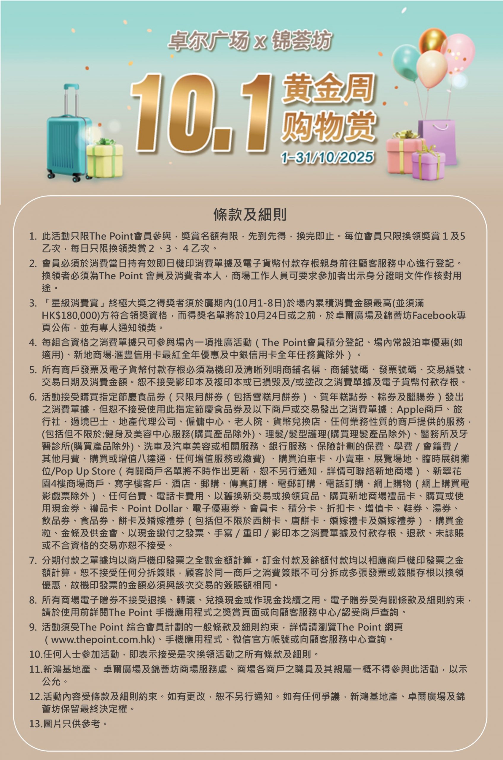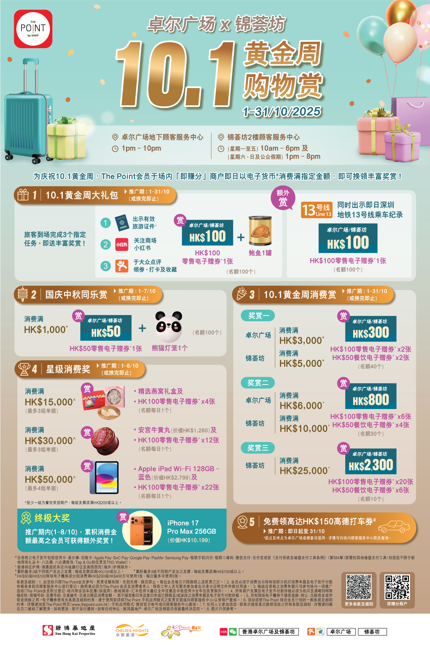 卓爾廣場 ● 10.1黃金周購物賞 為慶祝10.1黃金周,The Point會員於卓爾廣場或錦薈坊「即賺分」商戶消費,即有機會贏取豐富獎賞,當中包括最新iPhone 17 Pro Max! 活動受條款及細則約束,詳情請參閱場內宣傳品或向顧客服務中心查詢。